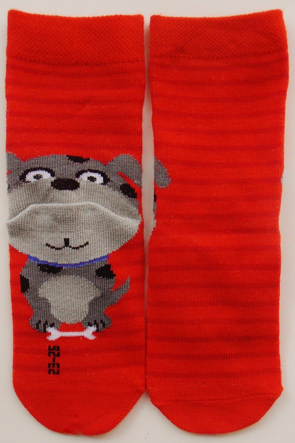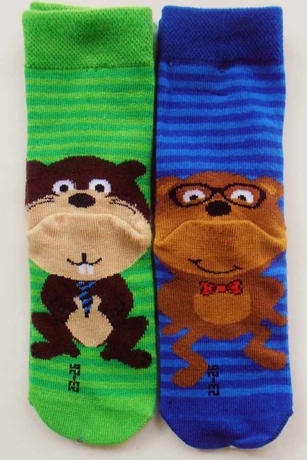 Dětské ponožky se zajímavě řešeným vzorem zvířátka na patě. Přední strana je pruhovaná.