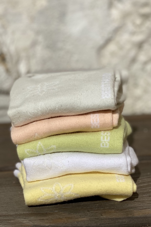 Snížené bavlněné ponožky. V modních pastelových barvách, vzor tvoří něžné bílé kytičky pouze na přední, viditelné straně ponožky.