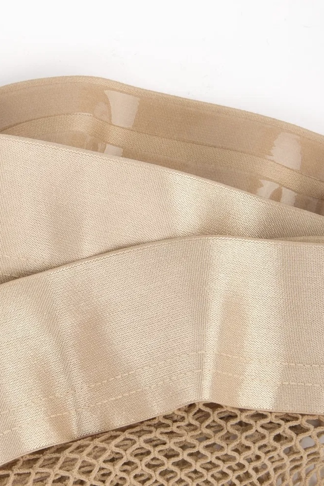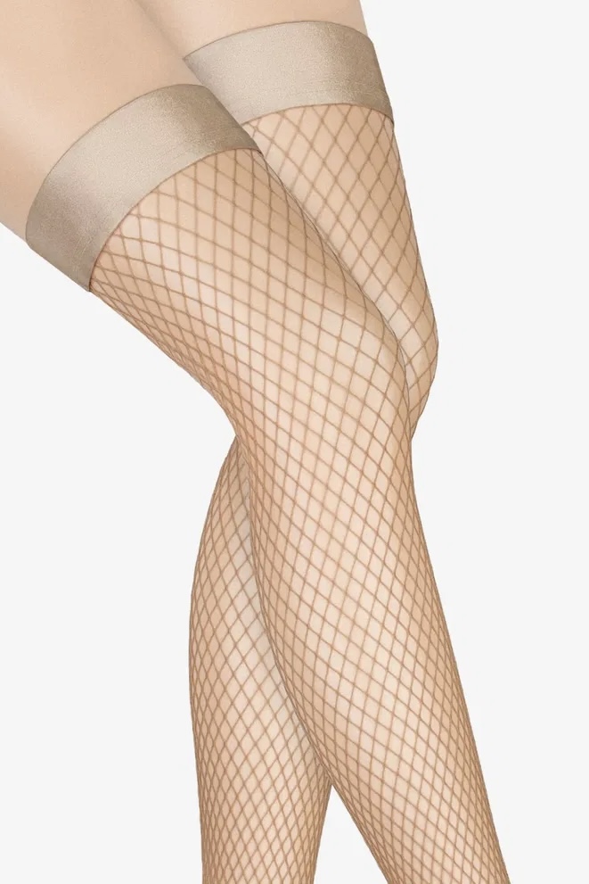 Self-supporting fishnet stockings with a smooth hem. The stockings are very stretchy and elastic. The toe of the stockings is not reinforced, but is made of dense knitting.
