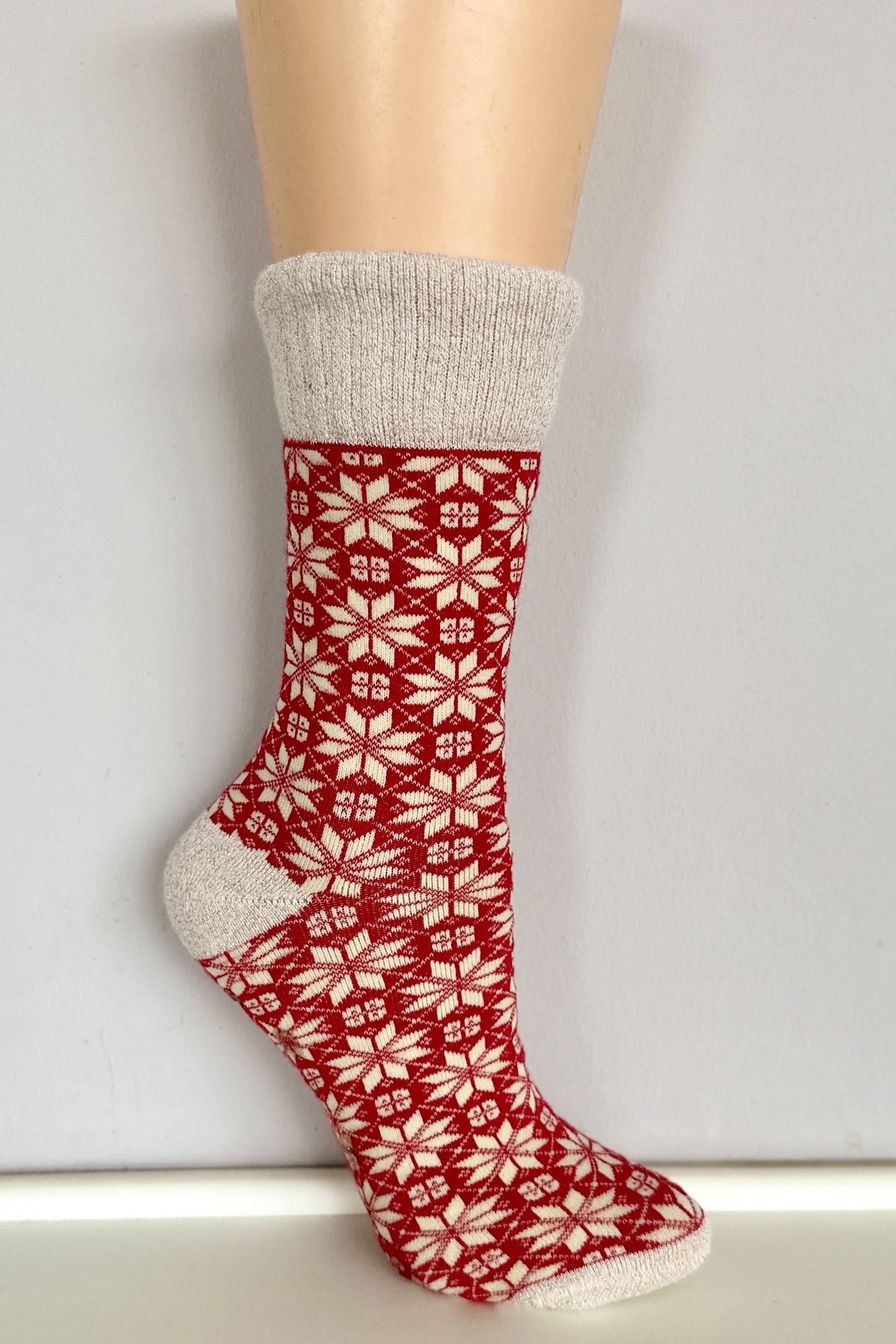 Hřejivé ponožky s elegantní zimním vzorem, ozvláštněné zlatou nitkou.
