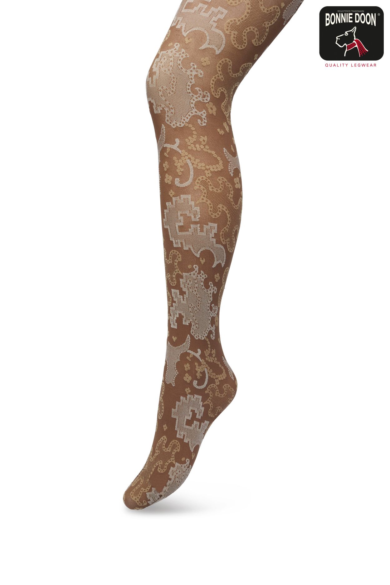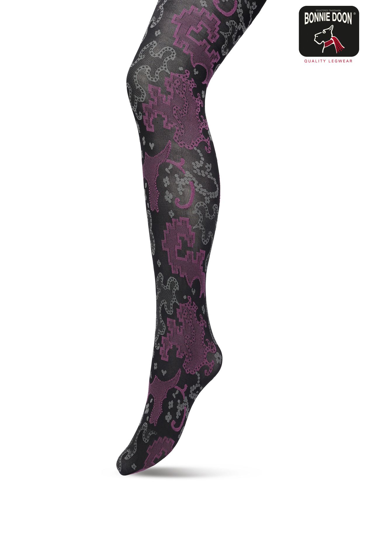 Punčocháče se vzorem ornamentů, vyšitých na jednobarevném mikrovláknovém neprůhledném podkladě.